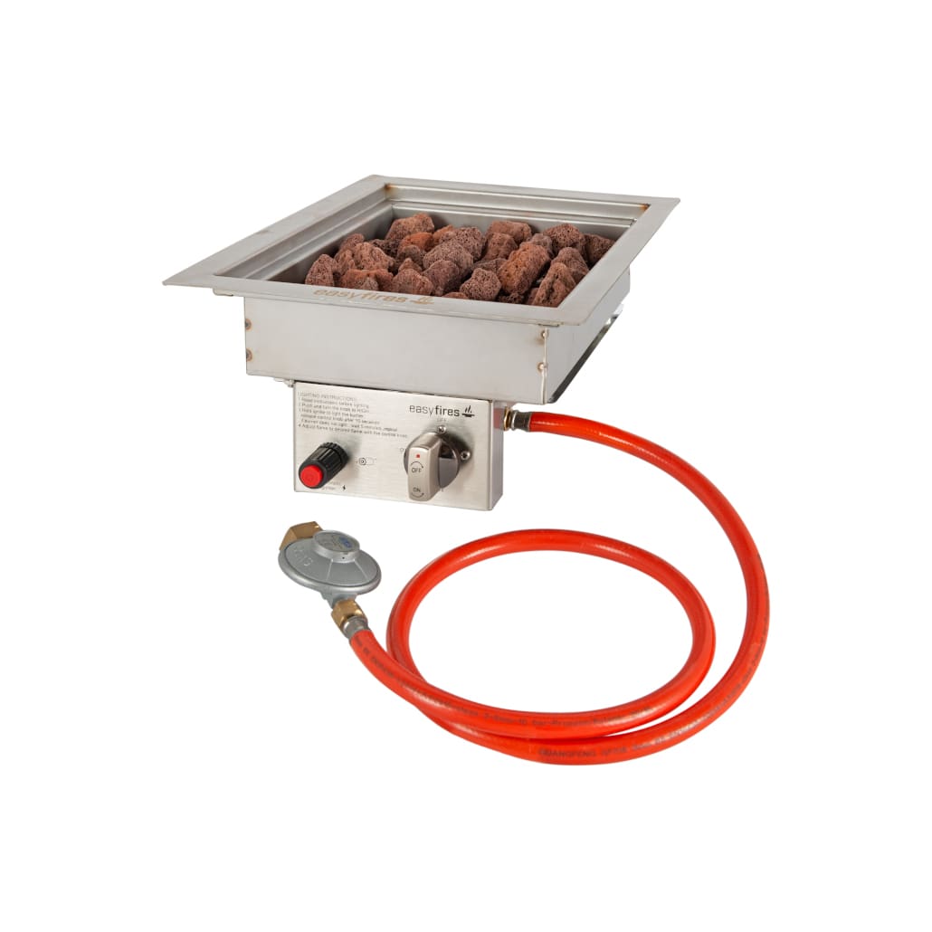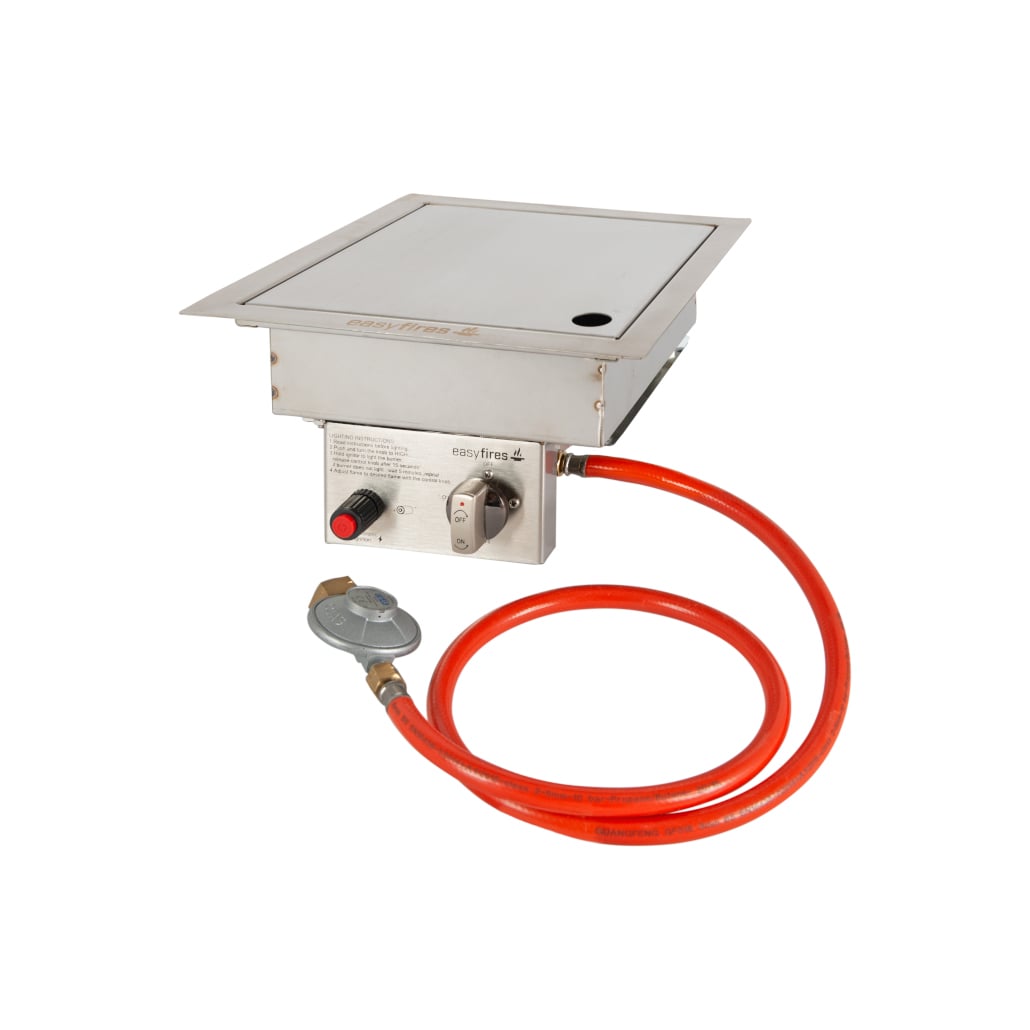 Vierkante inbouwhaard van 2 mm dik staal voorzien van zeer hitte bestendige coating | Elektrische ontsteker | Druk regelaar 30mbar | Lavastenen | 1 meter gasslang | Bedieningspaneel | Deksel | 2 Jaar garantie | Een vermogen van 8,8 kwh.