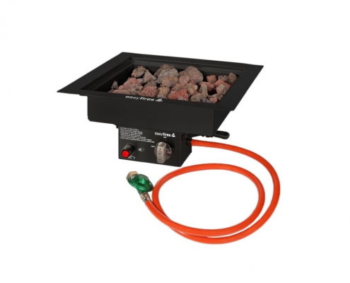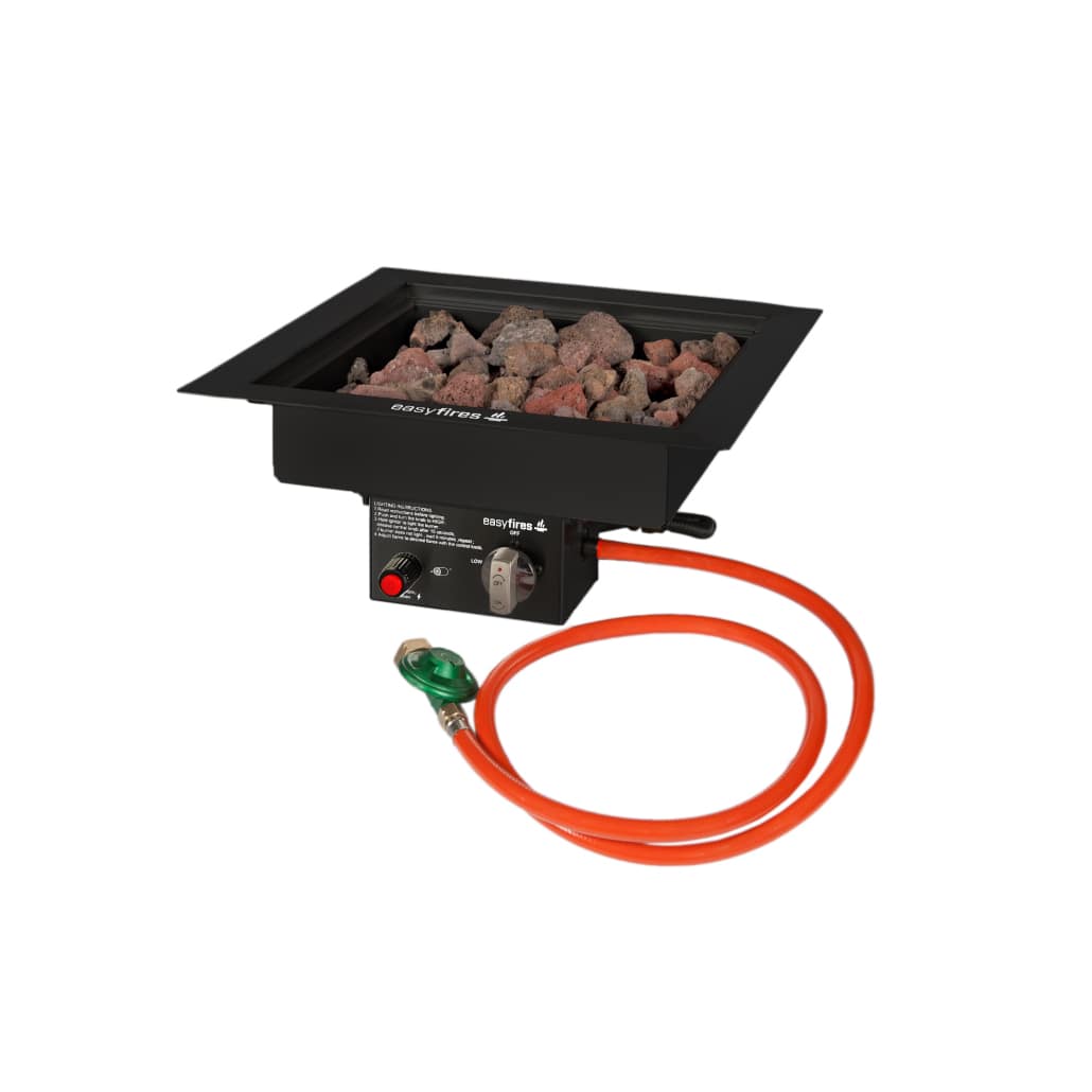 Vierkante inbouwhaard van 2 mm dik staal voorzien van zeer hitte bestendige coating | Elektrische ontsteker | Druk regelaar 30mbar | Lavastenen | 1 meter gasslang | Bedieningspaneel | Deksel | 2 Jaar garantie | Een vermogen van 8,8 kwh.